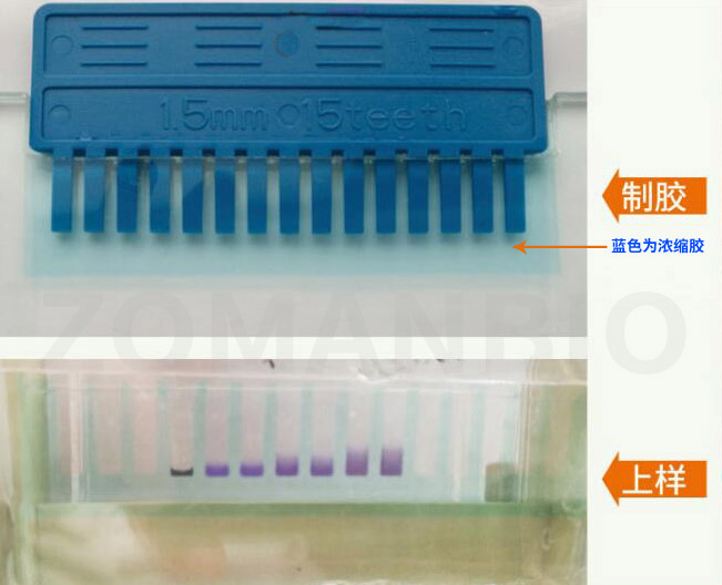 超快SDS-PAGE凝膠制備試劑盒(ZD304C)作為一款基礎(chǔ)的制膠產(chǎn)品,自上市起便廣受客戶好評(píng)。為增加客戶使用體驗(yàn),產(chǎn)品進(jìn)一步升級(jí),在試劑盒組成中新添加了藍(lán)色染料,可將濃縮膠染成藍(lán)色,使得樣孔清晰可見(如圖1),極大方便上樣操作。