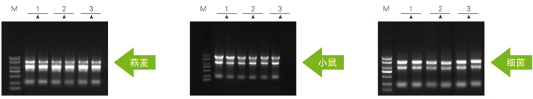 以上參考圖分別取50mg燕麥葉片,20mg小鼠肝臟和1ml細菌DH5α菌液各數份,組織進行液氮研磨處理,菌液離心收集細胞后,分別加入1ml Zomanbio RNApure 和 T、I公司相應產品,按各自說明書進行RNA提取。洗脫體積分別為80μl、100μl、60μl。RNA電泳上樣量分別為5μl,1%瓊脂糖凝膠電泳。