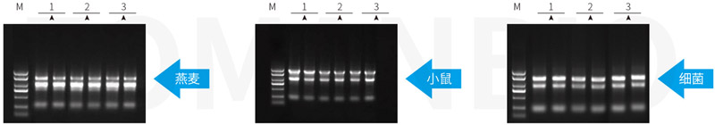 以上參考圖分別取50mg燕麥葉片,20mg小鼠肝臟和1ml細菌DH5α菌液各數(shù)份,組織進行液氮研磨處理,菌液離心收集細胞后,分別加入1ml Zomanbio RNApure 和 T、I公司相應產(chǎn)品,按各自說明書進行RNA提取。洗脫體積分別為80μl、100μl、60μl。RNA電泳上樣量分別為5μl,1%瓊脂糖凝膠電泳。
