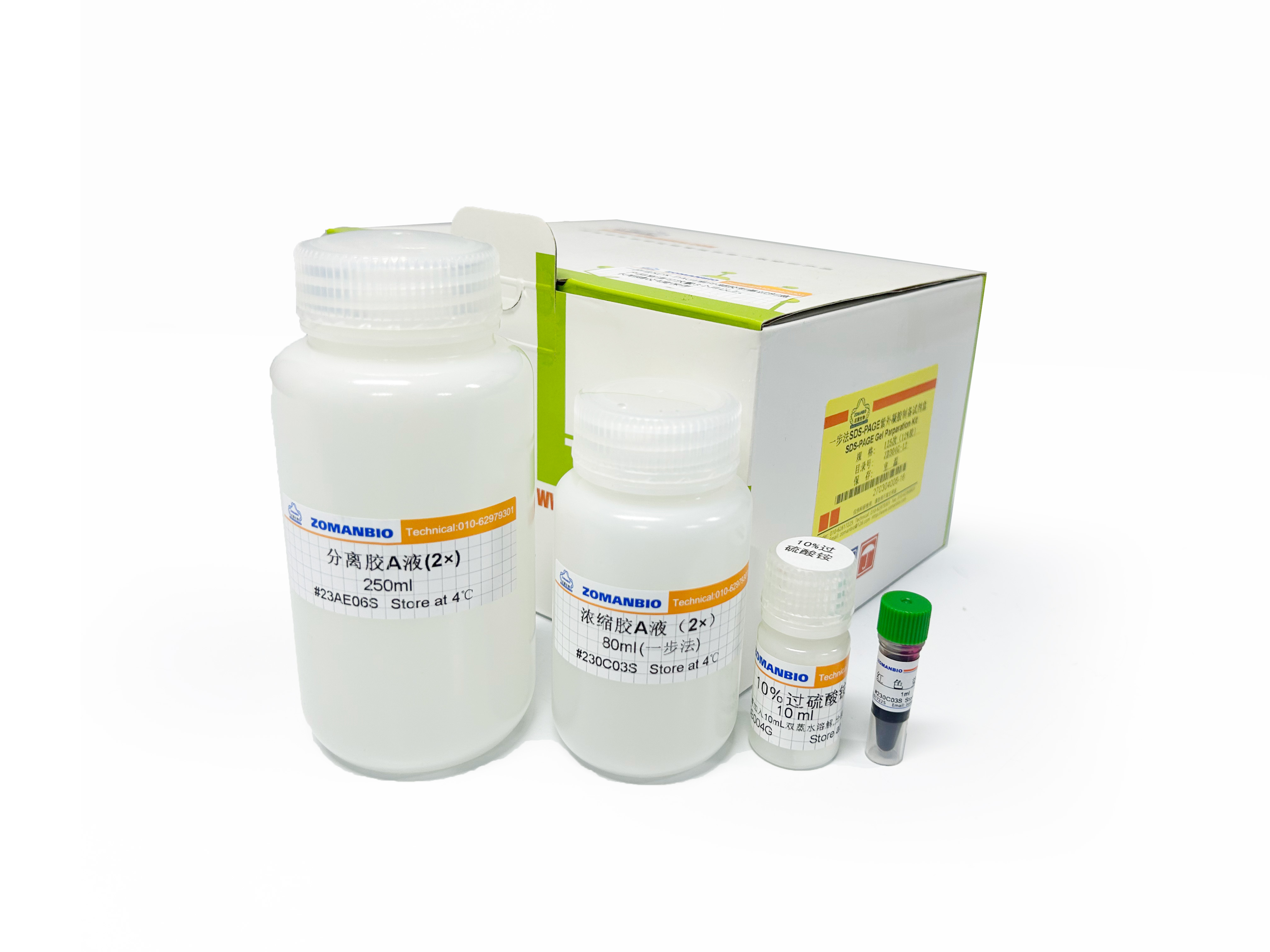 本產(chǎn)品為可紫外照射凝膠快速顯示蛋白條帶的一步法PAGE凝膠的預(yù)混配方。產(chǎn)品只需要1:1添加后,再加入催化劑---過(guò)硫酸銨,且支持一步灌膠,無(wú)需等待分離膠凝固再灌濃縮膠,此濃縮膠可以添加染料,使上樣孔更清晰,方便點(diǎn)樣。制備的凝膠與傳統(tǒng)Tris-甘氨酸電泳液完美兼容,且電泳方法一致。