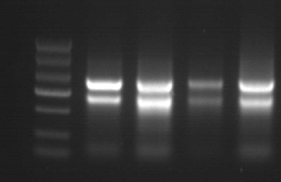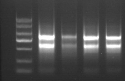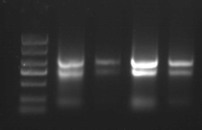 取50mg新鮮樣品,使用ZP434提取總RNA,洗脫體積100μL。 1%瓊脂糖凝膠電泳, 上樣量為2μL,5v/cm電泳15min。 注:以上樣品提取均未加β-巰基乙醇 |