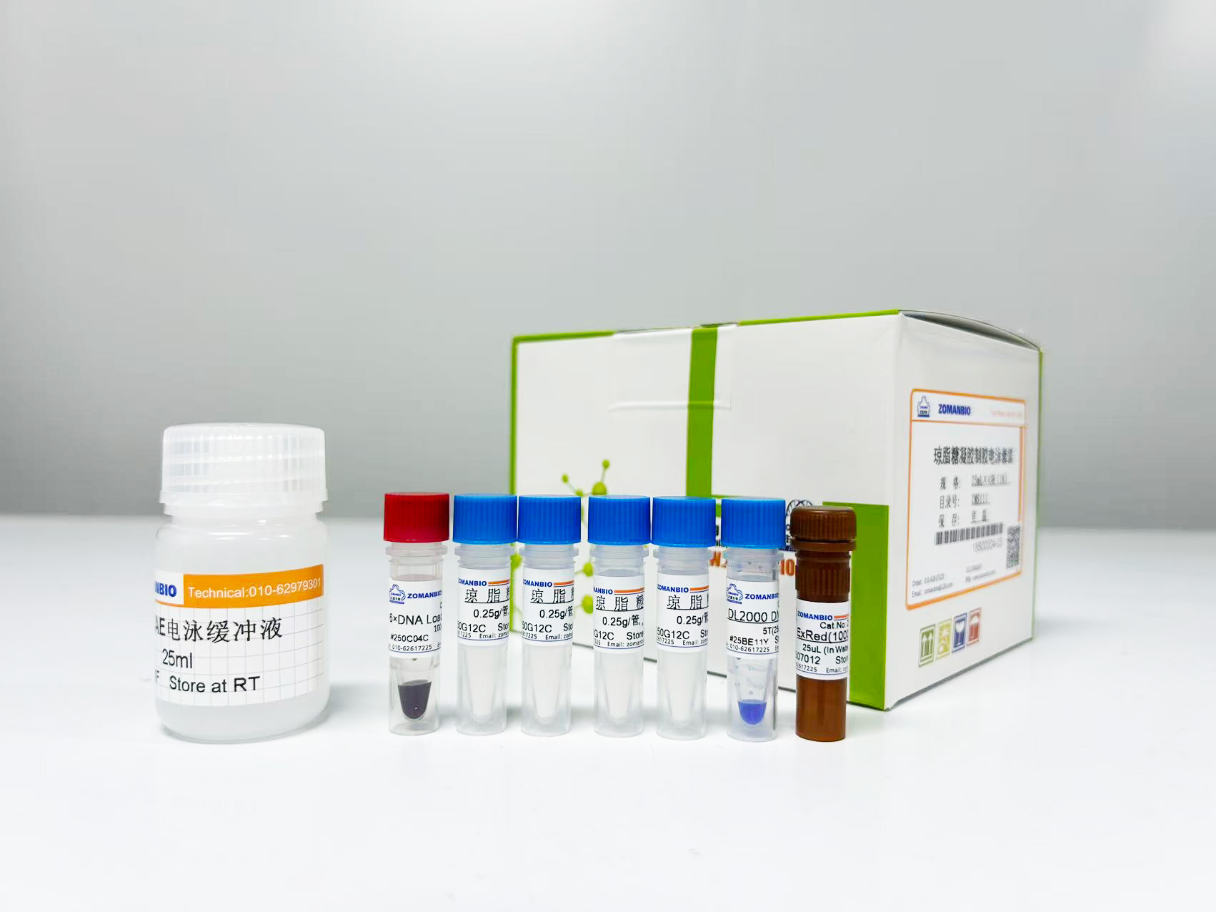 本試劑盒依據(jù)瓊脂糖凝膠電泳實(shí)驗(yàn)原理,提供瓊脂糖、50×電泳緩沖液和核酸染料、6×DNA Loading buffer、 DNA Marker。本產(chǎn)品提供的核酸染料是一種新型核酸染料對(duì)人體無(wú)毒害。使用時(shí)用適量電泳緩沖液將瓊脂糖溶解,并將核酸染料溶解至膠液中混勻制膠,然后將樣品與 6×DNA Loading buffer 混勻后上樣,即可進(jìn)行瓊脂糖凝膠電泳實(shí)驗(yàn)。具有快速簡(jiǎn)便、靈敏度高、穩(wěn)定性好等優(yōu)點(diǎn)。