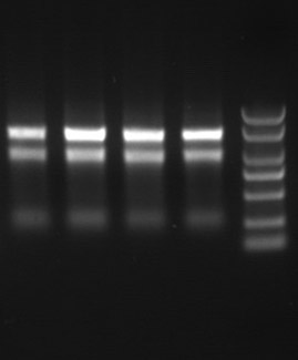 | 1%瓊脂糖凝膠電泳 1:89.2mg小麥莖 2:101.4mg馬鈴薯莖