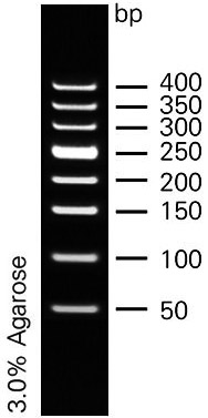 本產(chǎn)品是由8條線性雙鏈DNA條帶組成,適用于瓊脂糖凝膠電泳中DNA條帶的分析。本產(chǎn)品為即用型產(chǎn)品,已含有1×loading buffer,可根據(jù)實驗需要,直接取2-5μl電泳,使用方便,電泳圖像清晰。本產(chǎn)品中8條帶分為50,100,150,200,250,300,350,400bp,其中250bp條帶約為100ng/5μl,顯示加亮帶,其余條帶濃度約為50ng/5μl。