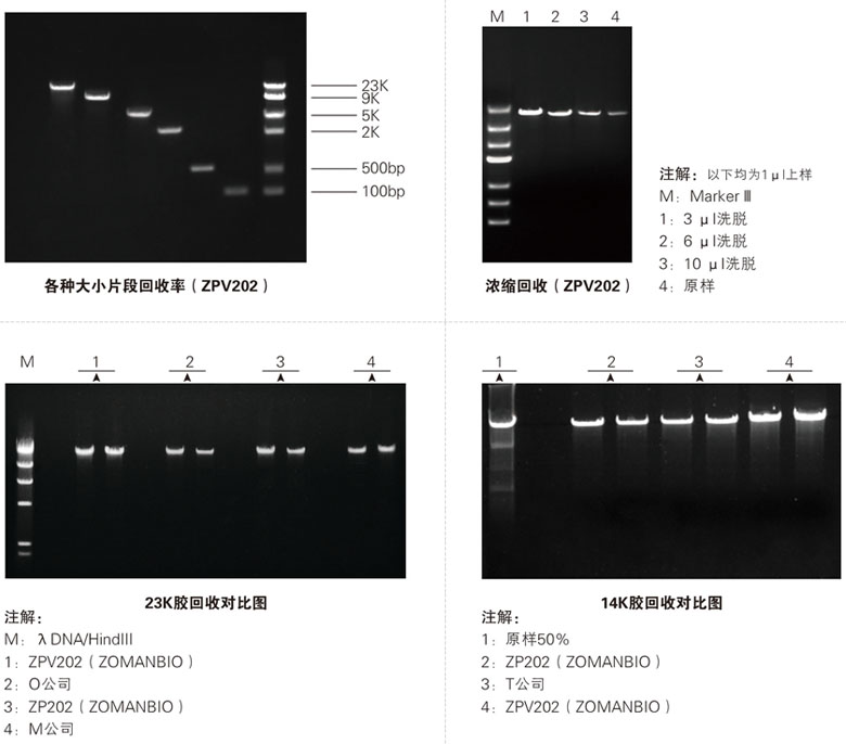 本試劑盒采用獨(dú)特的微量洗脫離心吸附柱和精心優(yōu)化的溶膠液體系,洗脫體積幾乎無(wú)損耗(10 ul即可完全洗脫,甚至可3 ul超低量洗脫),承載量高達(dá)10 ug。這些優(yōu)點(diǎn)使本產(chǎn)品能從TAE或TBE瓊脂糖凝膠中回收100 bp~23 kb大小的DNA片段,且回收率可達(dá)80%以上,滿足多種實(shí)驗(yàn)需求。