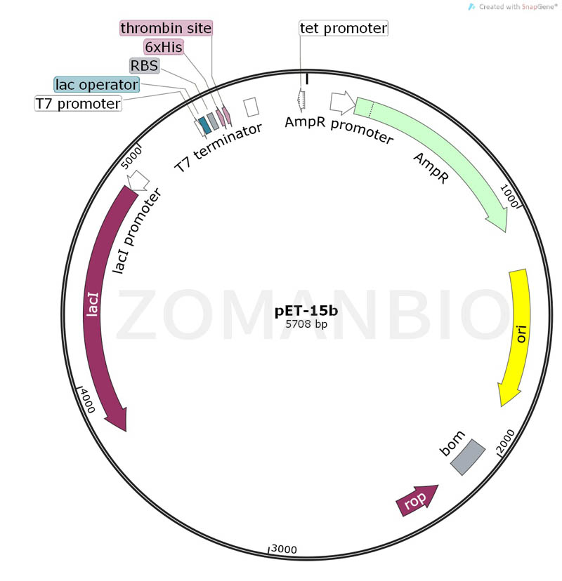 pET-15b質(zhì)粒是一種原核表達(dá)載體,含有一個N端的6×His標(biāo)簽、thrombin酶切位點和BamHI限制性內(nèi)切酶位點。表達(dá)由宿主細(xì)胞提供的T7 RNA聚合酶誘導(dǎo),目的基因被克隆到質(zhì)粒載體上,受噬菌體強(qiáng)轉(zhuǎn)錄及翻譯信號控制。pET系統(tǒng)是有史以來在大腸桿菌中表達(dá)重組蛋白的功能最強(qiáng)大的系統(tǒng),也是現(xiàn)今原核表達(dá)方面使用最廣泛的系統(tǒng)。該系列質(zhì)粒能很容易的通過降低誘導(dǎo)物的濃度來削弱蛋白表達(dá)。在非誘導(dǎo)條件下,可以使目的基因處于完全沉默狀態(tài)而不轉(zhuǎn)錄。The pET-15b vector carries an N-terminal His?Tag? sequence followed by a thrombin site and three cloning sites. Unique sites are shown on the circle map. Note that the sequence is numbered by the pBR322 convention, so the T7 expression region is reversed on the circular map. The cloning/expression region of the coding strand transcribed by T7 RNA polymerase is shown below.質(zhì)粒只保證關(guān)鍵序列正確,不保證表達(dá)效果。