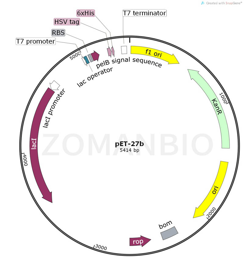 pET-27b質(zhì)粒是一種原核表達(dá)載體,C端含有一個6×His標(biāo)簽、HSV標(biāo)簽,N端含有一個pelB前導(dǎo)肽。該質(zhì)粒含有多個常用的酶切位點,便于不同基因克隆。表達(dá)由宿主細(xì)胞提供的T7 RNA聚合酶誘導(dǎo),目的基因被克隆到質(zhì)粒載體上,受噬菌體強轉(zhuǎn)錄及翻譯信號控制。