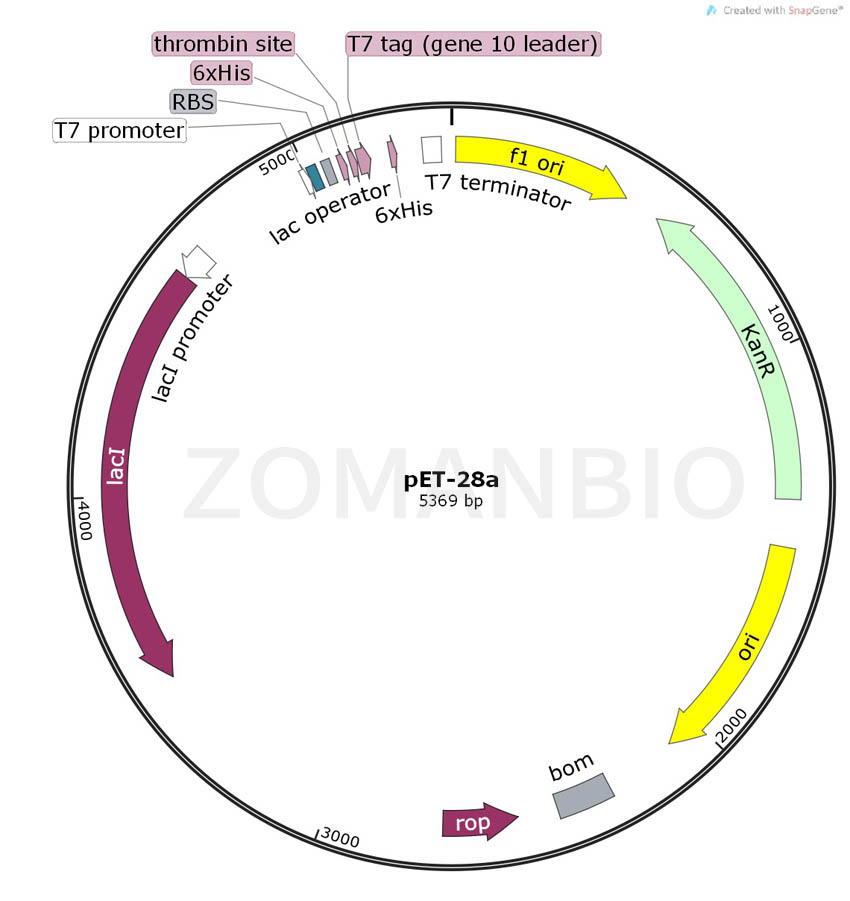 pET-28a質(zhì)粒是一種原核表達(dá)載體,C端含有一個6×His標(biāo)簽,N端含有6×His標(biāo)簽、thrombin酶切位點(diǎn)、T7標(biāo)簽。該質(zhì)粒含有多個常用的酶切位點(diǎn),便于不同基因克隆。表達(dá)由宿主細(xì)胞提供的T7 RNA聚合酶誘導(dǎo),目的基因被克隆到質(zhì)粒載體上,受噬菌體強(qiáng)轉(zhuǎn)錄及翻譯信號控制。pET28a載體的單一的多克隆位點(diǎn)見上面的環(huán)狀質(zhì)粒圖譜。注意:載體序列是以pBR322質(zhì)粒的編碼規(guī)矩進(jìn)行編碼的,所以T7蛋白表達(dá)區(qū)在質(zhì)粒圖譜上面是反向的。T7 RNA聚合酶啟動的克隆和表達(dá)區(qū)域在質(zhì)粒圖譜中也被標(biāo)注了出來。質(zhì)粒的F1復(fù)制子是被定向的,所以在T7噬菌體聚合酶的作用下,包含有蛋白編碼序列的病毒粒子能夠產(chǎn)生,并啟動蛋白表達(dá),同時蛋白表達(dá)將被T7終止子序列的作用下終止蛋白翻譯。pET系統(tǒng)是有史以來在大腸桿菌中表達(dá)重組蛋白的功能最強(qiáng)大的系統(tǒng),也是現(xiàn)今原核表達(dá)方面使用最廣泛的系統(tǒng)。該系列質(zhì)粒能很容易的通過降低誘導(dǎo)物的濃度來削弱蛋白表達(dá)。在非誘導(dǎo)條件下,可以使目的基因處于完全沉默狀態(tài)而不轉(zhuǎn)錄。 質(zhì)粒只保證關(guān)鍵序列正確,不保證表達(dá)效果。