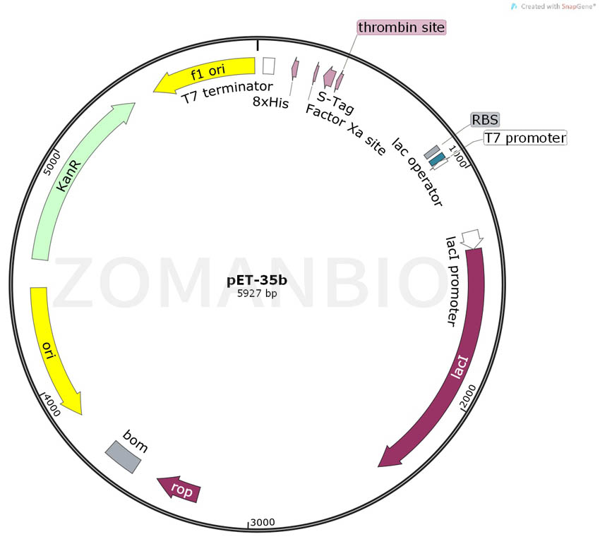 The pET-35b(+) vector is designed for expression of CBDclos fusion proteins.A variety of cloning sites and strategies are available. Rapid directional cloning of PCR-ampli?ed DNA is available with the pET-35 Xa/LIC Vector Kit, which contains linearized pET-35b(+) ready for annealing with appropriately prepared inserts. When cloned with the Xa/LIC method, resulting CBDclos?Tag? fusion proteins can be cleaved precisely at the vector-encoded junction using Factor Xa. Unique sites are shown on the circle map. Note that the sequence is num-bered by the pBR322 convention, so the T7 expression region is reversed on the circle map. The cloning/expression region of the coding strand transcribed by T7 RNA polymerase is shown below.The f1 origin is oriented so that infection with helper phage will produce virions containing single stranded DNA that corresponds to the coding strand. Therefore, single stranded sequencing should be performed using the T7 terminator primer.