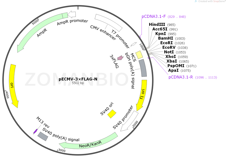 pECMV-3×FLAG-N含有一個(gè)在哺乳動(dòng)物細(xì)胞中高水平表達(dá)的強(qiáng)啟動(dòng)子CMV,以及易于用抗體檢測(cè)的3×FLAG標(biāo)簽,可用G418來(lái)篩選穩(wěn)定細(xì)胞系,多克隆位點(diǎn)MCS處有豐富的酶切位點(diǎn),可以用來(lái)連接目的片段,進(jìn)而和3×FLAG融合表達(dá)。