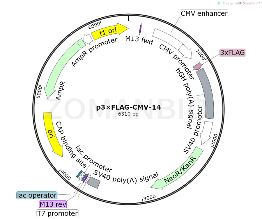 P3xFlag-CMV-14 expression vector is a 6.3 KB carrier derived from the pCMV5 vector, which is used for transient expression in mammalian cells or the stable expression of C terminal with 3xFlag tag fusion protein. Three adjacent Flag epitopes (Asp-Tyr-Lys-Xaa-Xaa-Asp) were encoded by the downstream fragment of the vector. This makes it possible to detect protein expression using M2 Flag antibody.