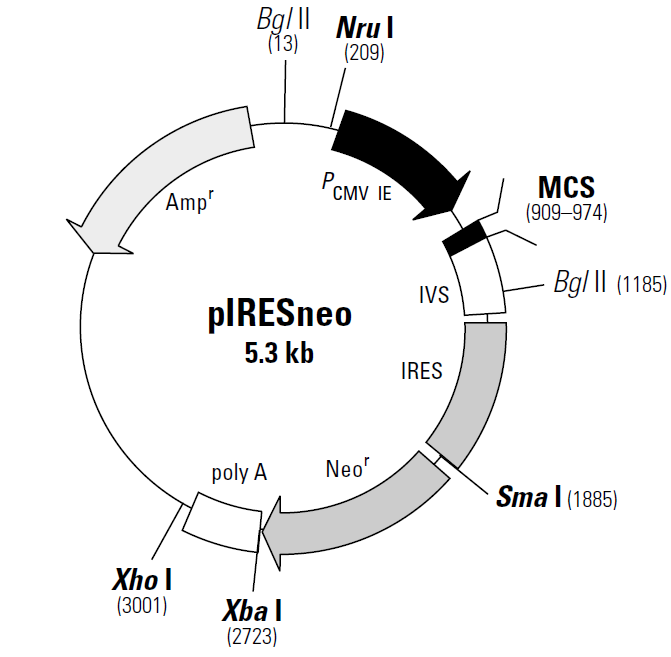 pIRESneo (originally described as pCIN4 by Rees et al.; 1) contains the internal ribosome entry site (IRES) of the encephalomyocarditis virus (ECMV), which permits the translation of two open reading frames from one messenger RNA (2, 3). After selection with G418, nearly all surviving colonies will stably express the gene of interest, thus decreasing the need to screen large numbers of colonies to find functional clones. The expression cassette of pIRESneo contains the human cytomegalovirus (CMV) major immediate early promoter/enhancer followed by a multiple cloning site (MCS), a synthetic intron known to enhance the stability of the mRNA (4), the ECMV IRES followed by the neomycin phosphotransferase (NPT II) gene, and the polyadenylation signal of the bovine growth hormone. Ribosomes can enter the bicistronic mRNA either at the 5' end to translate the gene of interest or at the ECMV IRES to translate the antibiotic resistance marker.