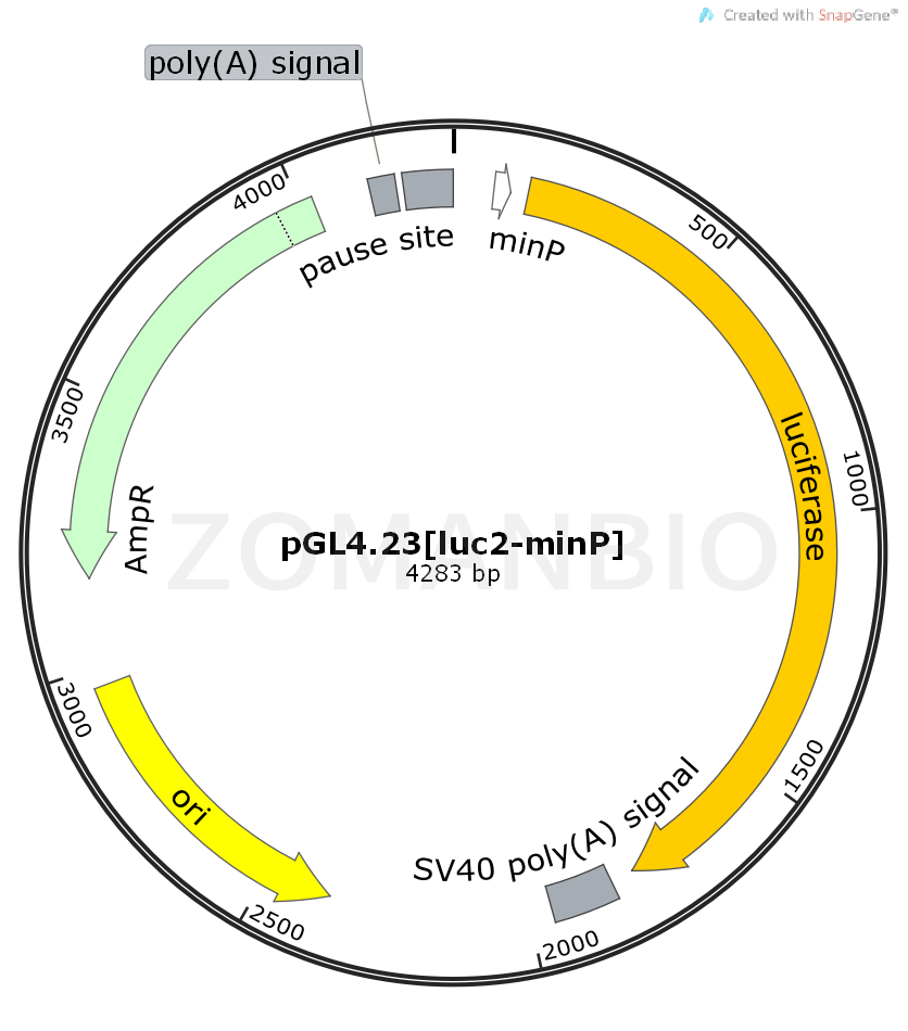 The pGL4.23[luc2/minP] Vector(a–e)encodes the luciferase reporter gene luc2 (Photinus pyralis) and is designed for high expression and reduced anomalous transcription. The pGL4.23[luc2/minP] Vector contains a multiple cloning region for insertion of a response element of interest upstream of a minimal promoter and a luc2 gene. luc2 is a synthetically-derived luciferase sequence with humanized codon optimization. The vector backbone contains an ampicillin resistance gene to allow for selection in E. coli.