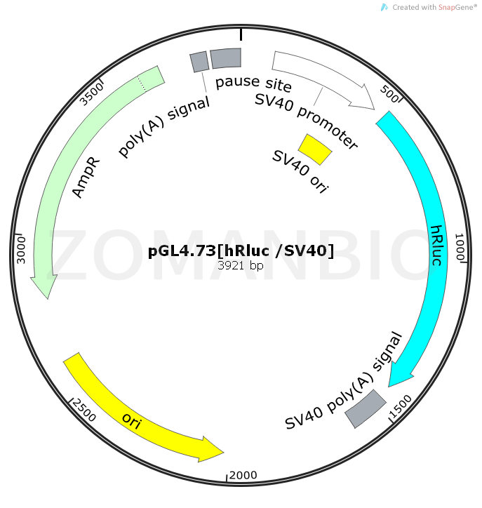 The pGL4.73[hRluc/SV40] Vector encodes the luciferase reporter gene hRluc (Renilla reniformis) and is designed for high expression and reduced anomalous transcription. The pGL4 Vectors are engineered with fewer consensus regulatory sequences and a synthetic gene, which has been codon optimized for mammalian expression.The pGL4.73[hRluc/SV40] Vector contains the hRluc reporter gene and an SV40 early enhancer/promoter and can be used as an expression control or a co-reporter vector.