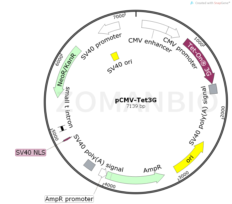 pCMV-Tet3G is used to develop stable Tet-On 3G cell lines, which are hosts for Tet-inducible gene expression systems. To create a Tet-inducible expression system, a vector containing a gene of interest under the control of the Tet-inducible TRE3G promoter (PTRE3G) is transfected into a Tet-On 3G cell line. The addition of Dox to the system causes Tet-On 3G to undergo a conformational change that allows it to bind to PTRE3G, activating transcription of the gene of interest in a highly dose-dependent manner.