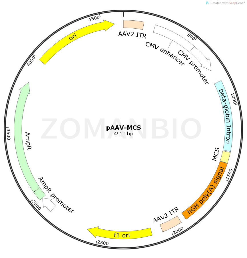 pAAV-MCS載體含有在哺乳動物細胞中基因的高水平表達的CMV啟動子和其他元素時。該載體包含AAV-2末端反向重復(fù)序列(ITRS),能和pAAV-RC2、pHelper質(zhì)粒一起包裝成腺相關(guān)病毒。