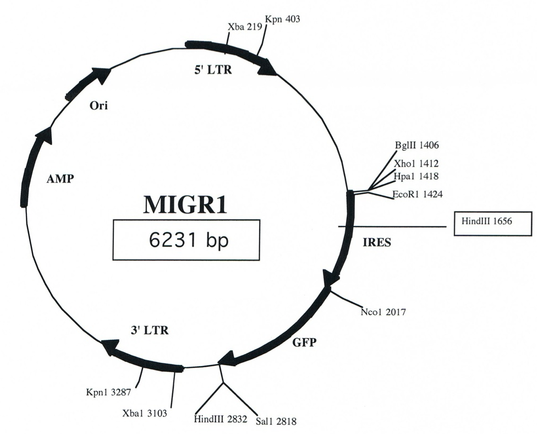 MIGR1 is a high copy of the plasmid, at 37 C under the culture of growth, its background vector is MSCV, the carrier size is 6231bp.