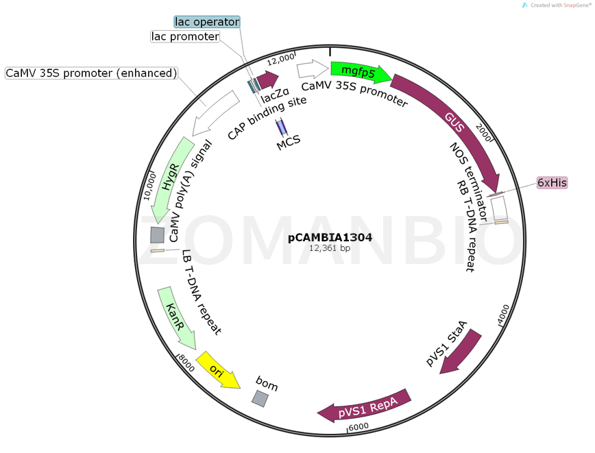 Vector contains kanamycin resistance gene for bacterial selection, hygromycin B resistance gene for plant selection and the mgfp5:gusA fusion reporter genes.The pCambia vector backbone is derived from the pPZP vectors. The pCambia1304 vector offers:1.high copy number in E.coli for high DNA yield?2.pVS1 replicon for high stability in Agrobacterium 3.small size?4.restriction sites for modular plasmid modifications and small but adequate polylinkers for introducing DNA of interest 5.bacterial selection with kanamycin?6.plant selection with hygromycin B 7.simple means to construct translational fusions to mgfp5-gusA reporter genes.