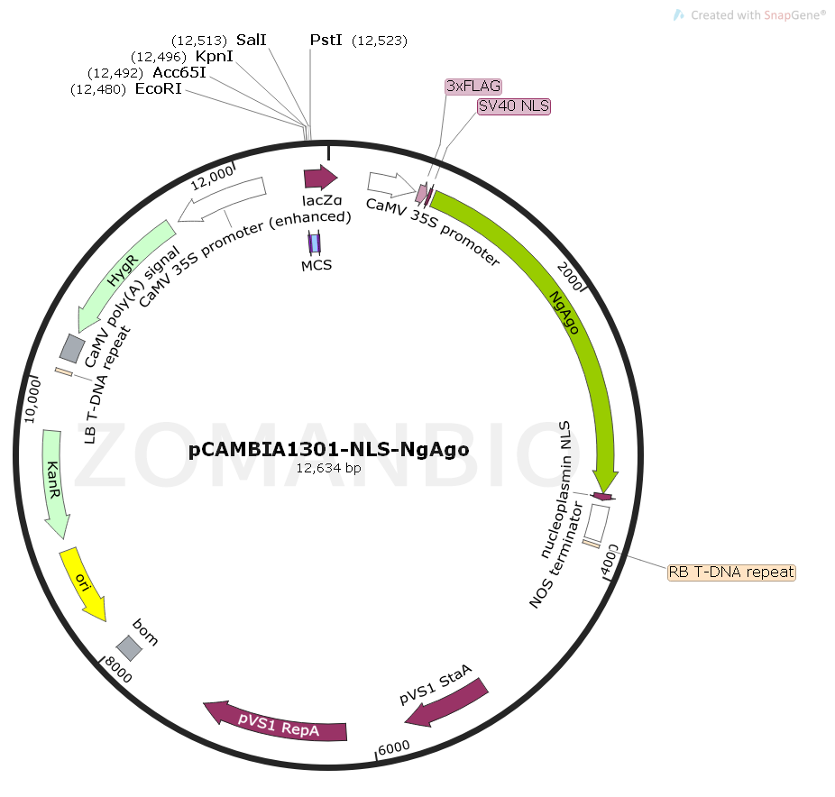 pCAMBIA1301-NLS-NgAgo是一個(gè)在植物細(xì)胞中表達(dá)NgAgo蛋白酶的質(zhì)粒。