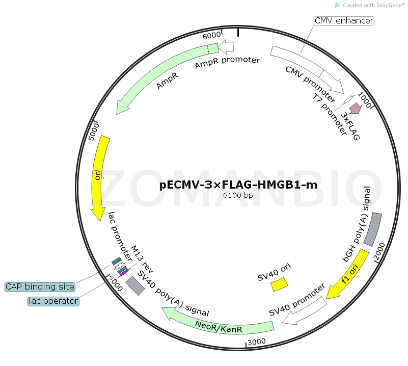 pECMV-3×FLAG-HMGB1-m質(zhì)粒是在pECMV-3×FLAG載體的基礎(chǔ)上改造而成,CMV啟動小鼠源HMGB1基因的過表達,N端的3×FLAG融合標簽能很好的被FLAG抗體識別。該質(zhì)粒可作為過表達質(zhì)粒直接轉(zhuǎn)染哺乳細胞。質(zhì)粒本身帶有Neo篩選標記,可用G418篩選轉(zhuǎn)染后的細胞得到穩(wěn)轉(zhuǎn)細胞系。