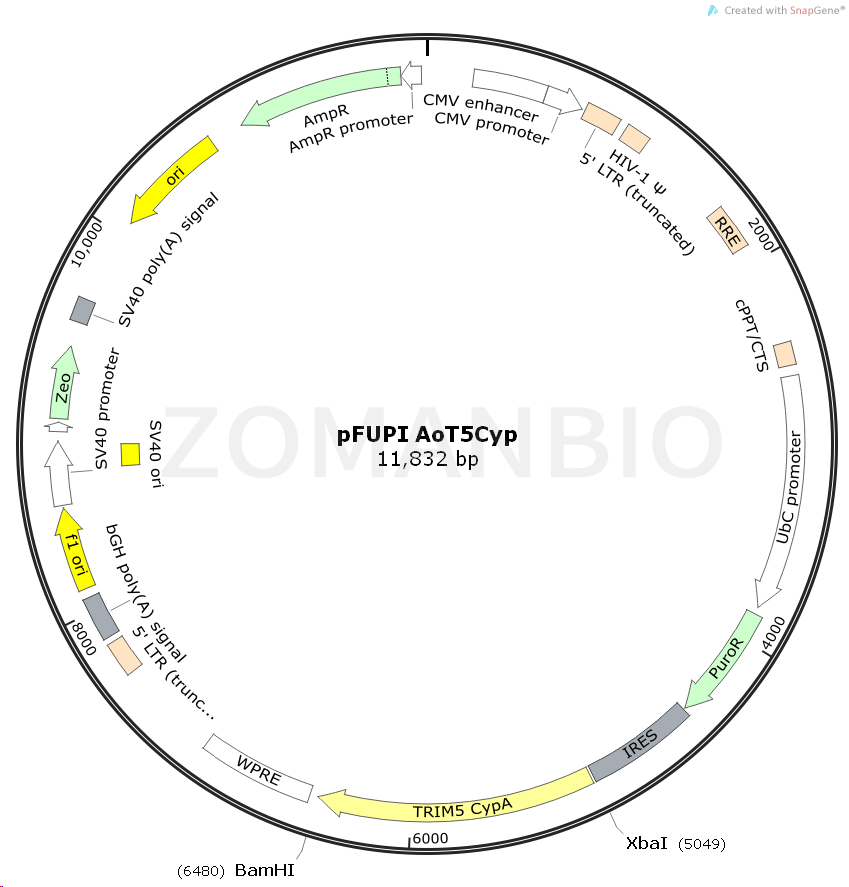 pFUPI AoT5Cyp質(zhì)粒通過Ubc啟動子表達貓頭鷹猴的TRIM5 CypA fusion基因,其質(zhì)粒的原始參考文獻:Potent inhibition of HIV-1 by TRIM5-cyclophilin fusion proteins engineered from human components.