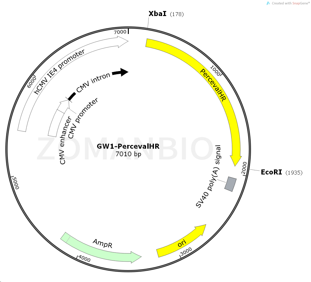 GW1-PercevalHR質(zhì)粒通過(guò)hCMV IE4 啟動(dòng)子驅(qū)動(dòng)PercevalHR基因的表達(dá),Mammalian expression vector (CMV promoter) of PercevalHR, a fluorescent sensor of ATP-to-ADP ratio.