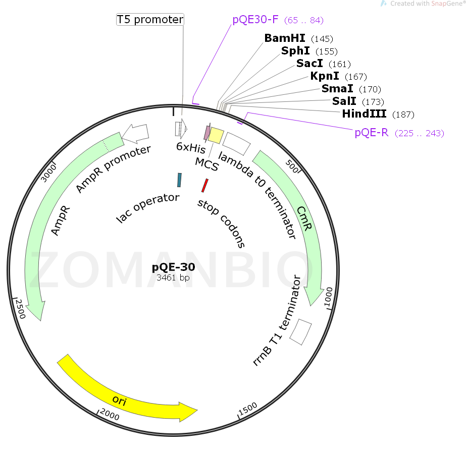 pQE-30質(zhì)粒含有一個(gè)強(qiáng)大的噬菌體T5啟動(dòng)子(被E.coli RNA 聚合酶識(shí)別),并含有兩個(gè)lac操縱子遏制模塊,用于在E.coli中嚴(yán)謹(jǐn)調(diào)控,高水平表達(dá)融合蛋白。在高水平lac遏制子存在的情況下,蛋白合成被有效阻斷,細(xì)胞毒素載體的穩(wěn)定性增強(qiáng),pQE載體可以在重組蛋白的N端或C端帶上6×His標(biāo)簽。