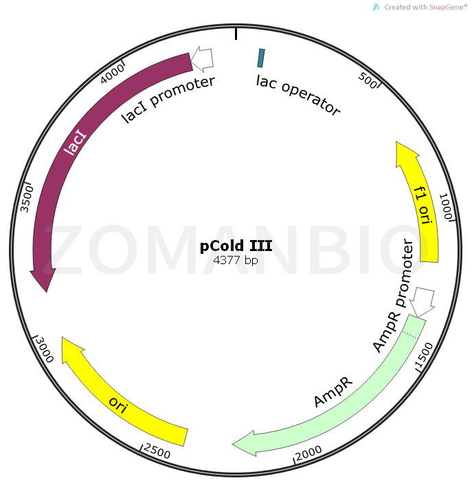 pCold III質(zhì)粒是利用冷休克基因CspA啟動子設計高效率蛋白質(zhì)表達載體。在啟動子下游處,插入了lac操縱子,以便嚴格控制表達。此外,5’非翻譯區(qū)(5’UTR),翻譯增強元件(TEE),His標簽序列,Xa因子切割位點和多克隆位點(MCS)位于CAPS啟動子的下游。當培養(yǎng)溫度切換到低溫時,大腸桿菌暫時停止生長,大部分的大腸桿菌蛋白質(zhì)表達減少,但是一類稱為冷休克蛋白的蛋白質(zhì)被特異性誘導表達。