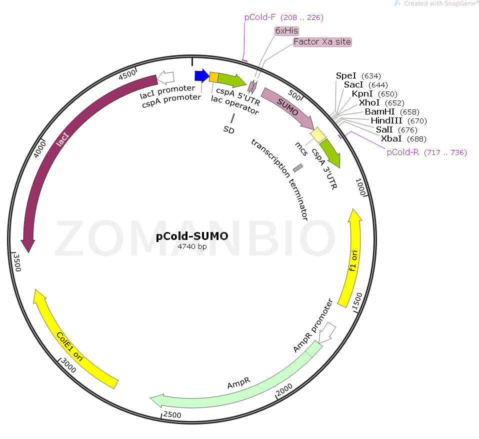 pCold-SUMO質(zhì)粒是利用冷休克基因CSPA啟動子設計高效率蛋白質(zhì)表達載體。在E.COLI啟動子下游處,插入了lac操縱子,以便嚴格控制表達。此外,5’非翻譯區(qū)(5’UTR),翻譯增強元件(TEE),His標簽序列,Xa因子切割位點和多克隆位點(MCS)位于CAPS啟動子的下游。當培養(yǎng)溫度切換到低溫時,大腸桿菌暫時停止生長,大部分的大腸桿菌蛋白質(zhì)表達減少,但是一類稱為冷休克蛋白的蛋白質(zhì)被特異性誘導表達。