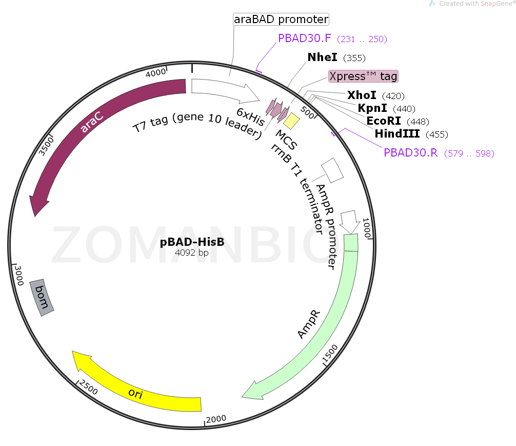 pBAD-HisB質(zhì)粒是衍生于pBR322載體。載體設(shè)計用來在大腸桿菌中進(jìn)行可調(diào)節(jié),劑量依賴性的表達(dá)和純化重組目的蛋白。使大腸桿菌araBAD啟動子(pBAD)增強(qiáng)了大腸桿菌重組蛋白可溶性表達(dá)的水平。pBAD/His和pBAD/Myc His載體上的調(diào)節(jié)蛋白AraC能夠調(diào)控pBad啟動子。pBAD/Myc-His B 載體是阿拉伯糖調(diào)控載體,在無葡萄糖的培養(yǎng)基中,阿拉伯糖正向調(diào)控目的基因的表達(dá),通過調(diào)節(jié)阿拉伯糖的濃度水平來優(yōu)化目的蛋白的可溶性表達(dá)。