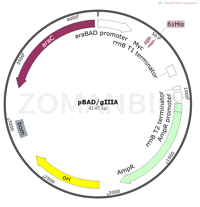 pBAD/gIII載體質(zhì)粒是衍生于pBR322載體。載體設(shè)計用來在大腸桿菌中進(jìn)行可調(diào)節(jié)分泌性表達(dá)和純化重組目的蛋白。使用基因III信號序列來定位重組蛋白,使其分泌到大腸桿菌周質(zhì)腔中。使用大腸桿菌araBAD啟動子(pBAD)增強了大腸桿菌重組蛋白可溶性表達(dá)的水平。載體上的調(diào)節(jié)蛋白AraC能夠調(diào)控pBad啟動子。