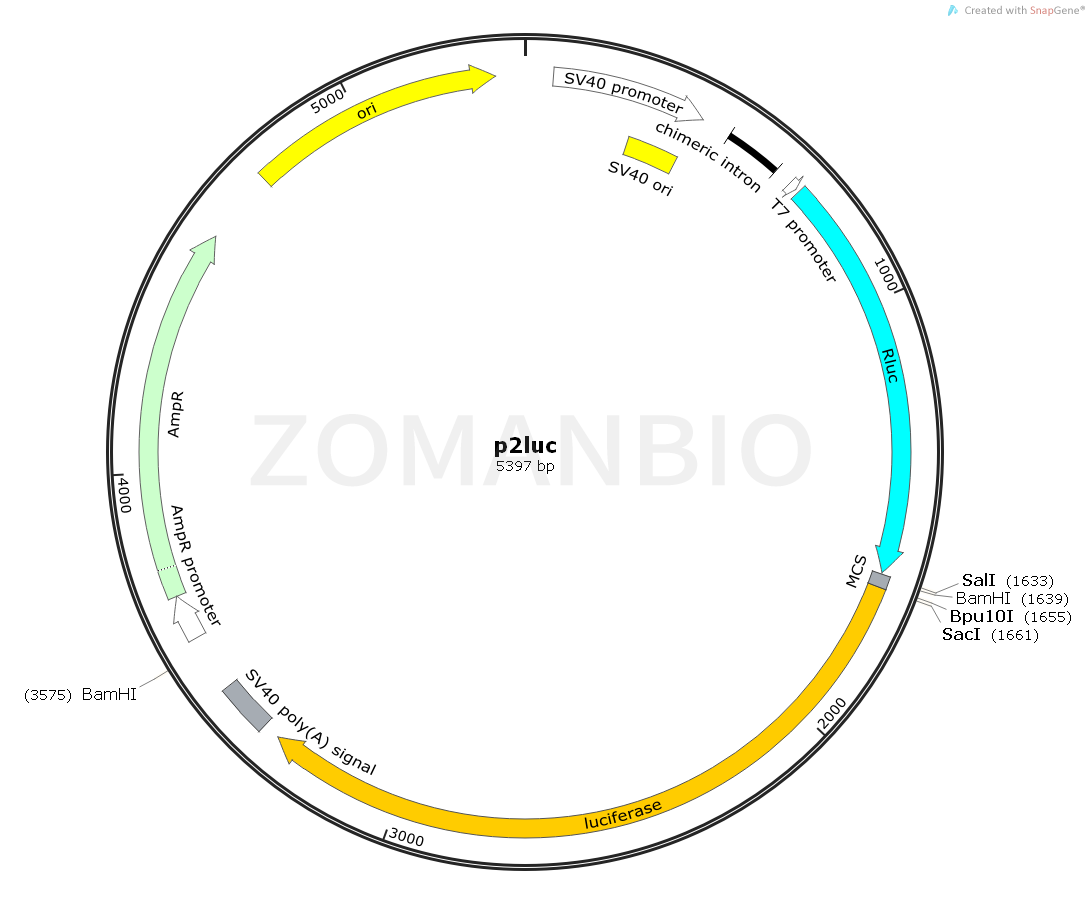 p2Luc是一個哺乳細(xì)胞雙熒光素酶報告質(zhì)粒。