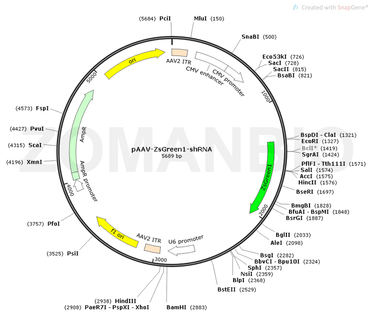 產(chǎn)品名稱:pAAV-ZsGreen1-shRNA(非空載)